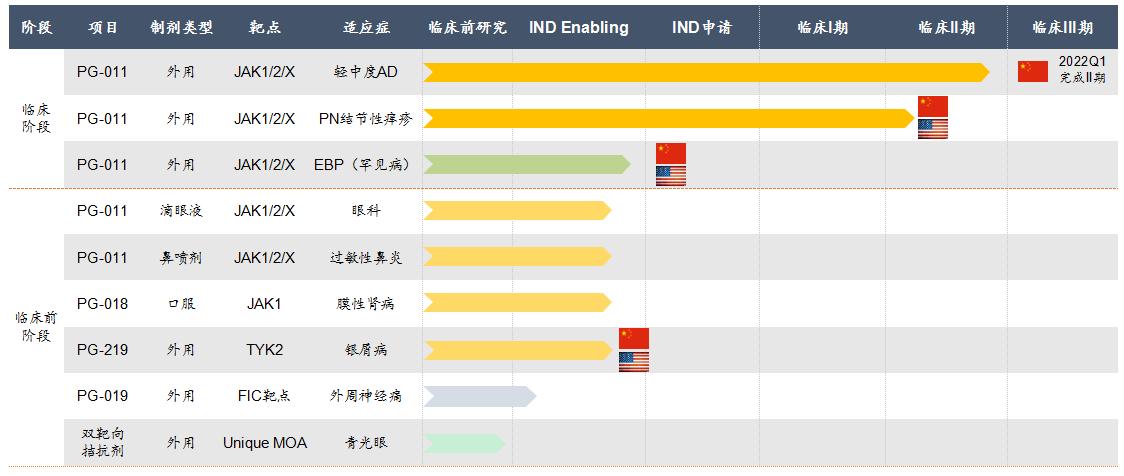 治疗领域聚焦于临床尚未满足需求的免疫性疾病,包括皮肤、眼科、鼻科等免疫性疾病、自身免疫性疾病、炎症和罕见病等;公司核心产品PG-011,是一款外用选择性小分子抑制剂,是首个进入临床的兼顾炎症和免疫调节以及组织修复的JAK多功能小分子化合物。