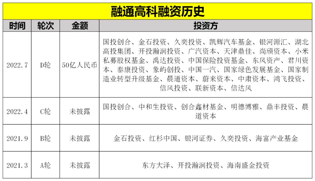 而且,融通高科今年7月完成的D轮融资,金额高达50亿元。投后估值达到180亿元。在这一轮融资中,除了风险投资基金外,更引人注目的是引进了6家汽车产业资本:一汽、广汽、上汽、东风、小米、蔚来。