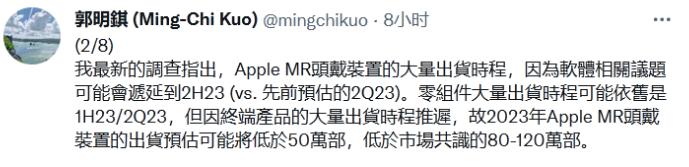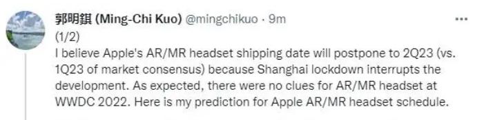 那个时候,他表示:预计苹果的AR(增强现实)/MR(混合现实)设备出货日期将推迟到2023年第二季度,而非市场预测的2023年第一季度。