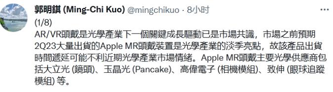 对于延期出货的影响,郭明錤认为:苹果的头显设备是光学产业下一个关键成长驱动,市场之前预期2023年第二季度大量出货的 (想做当时的光学产业中的淡季亮点) ,故该产品出货时间递延可能不利近期光学产业市场情绪。