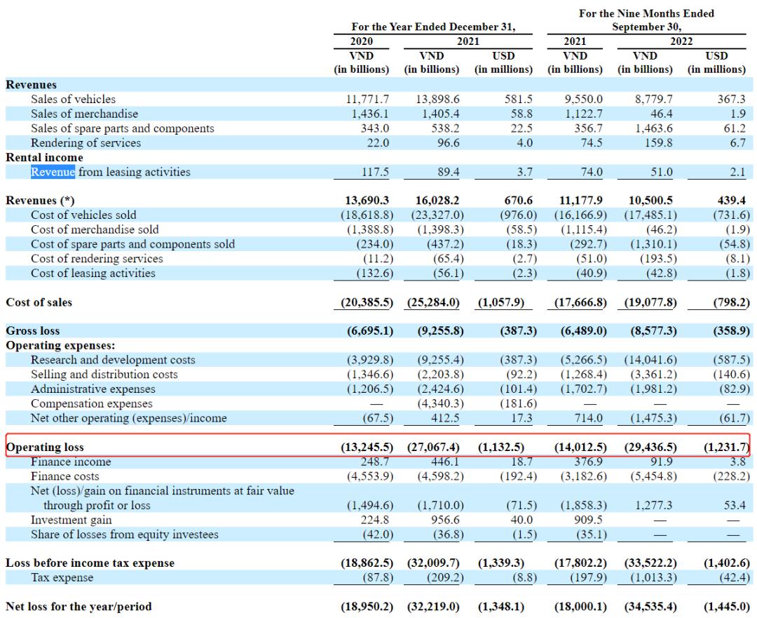 根据招股书数据,VinFast 2021财年运营亏损、净亏损分别为11.33亿美元和13.48亿美元,今年前三个季度这两项数据更是分别达到12.32亿美元和14.45亿美元。