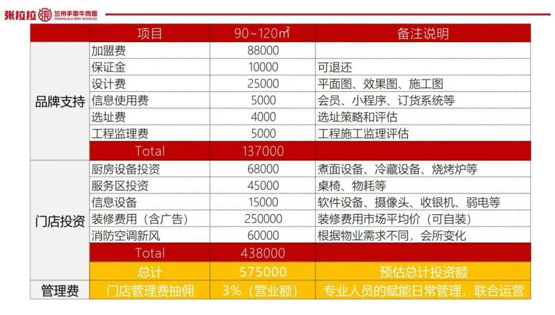 根据上述招商人员提供的文件,加盟一家张拉拉所需的前期投入约在57.5万元,包含8.8万元加盟费、门店选址和设计、设备采购、系统使用费等。而扣除食材、房租、人工、水电以及每月营收3%的管理费后,一间门店的净利润率大概在17%(约5.95-6.8万)。以此推算,快则10个月,加盟商就能收回前期投入的全部成本,此后开始盈利。