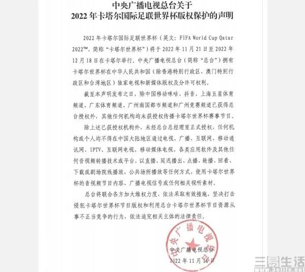 很快抖音方面给出回应称,根据合作协议约定,世界杯赛事期间中央广播电视总台向抖音提供超高清(4K)节目信号,抖音集团及旗下产品向用户提供“超高清4k免费世界杯直播”服务符合实际情况,并且有明确的合同依据。