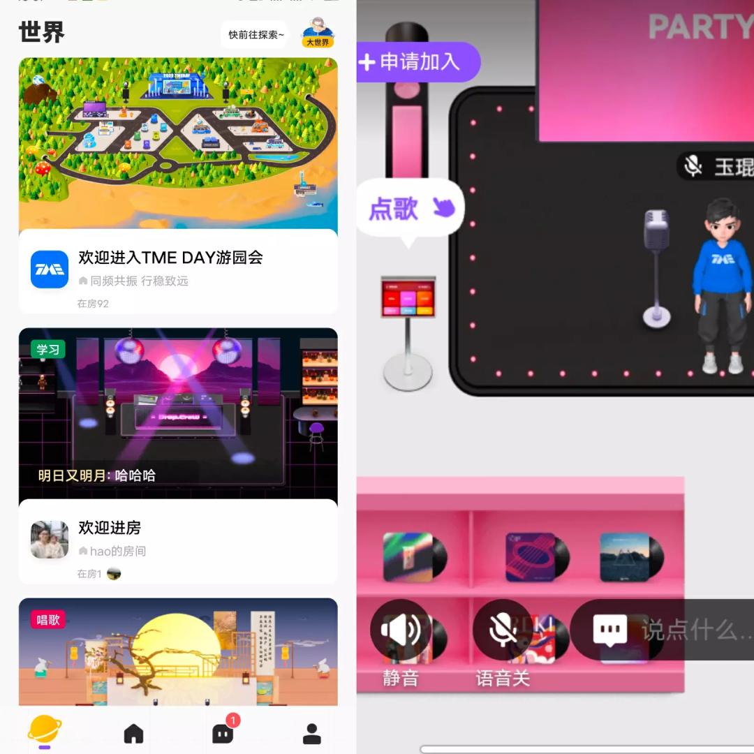 在“世界”里,用户可以以虚拟形象进入学习、唱歌、派对等房间,在这些房间里,房间主人摆设了一些专辑,用户可以点房间主人设置的歌,并以虚拟形象在房间里上台唱歌。