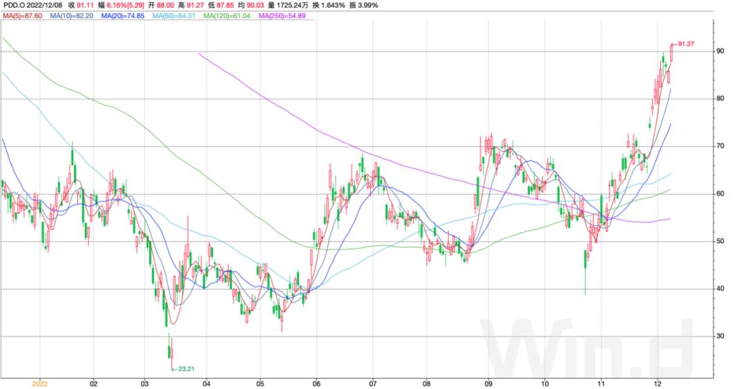 然而,拼多多交出了一份亮眼的三季度财报。 财报发布当日(11月28日),拼多多美股收盘大涨逾12%。之后,又迎来一轮连续上涨行情。