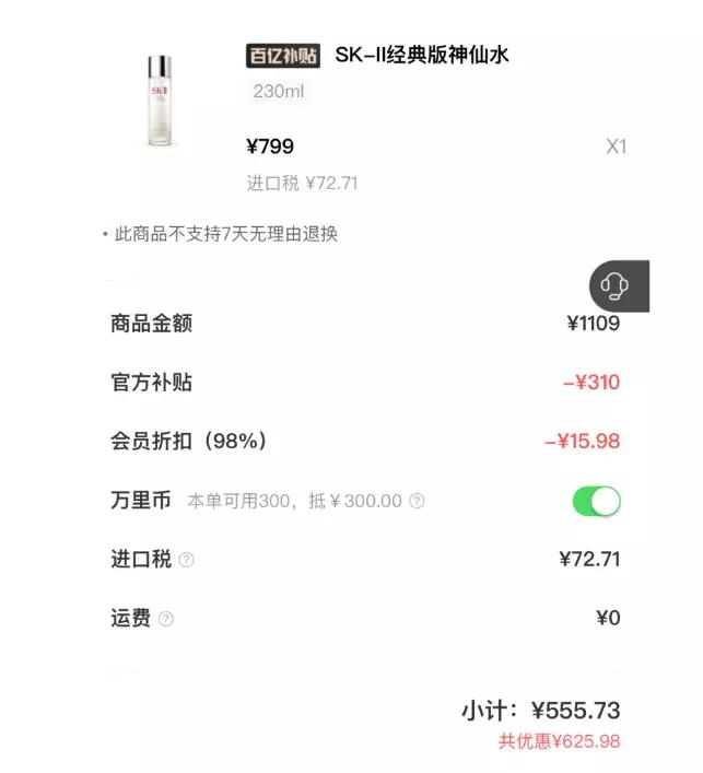 奢侈品电商万里目曾在2020年时,同样将三折SK-II神仙水作为平台引流产品。有网友曾晒出当时的订单,订单显示加上平台补贴和会员折扣,一瓶230ml的神仙水实付价只需555元。
