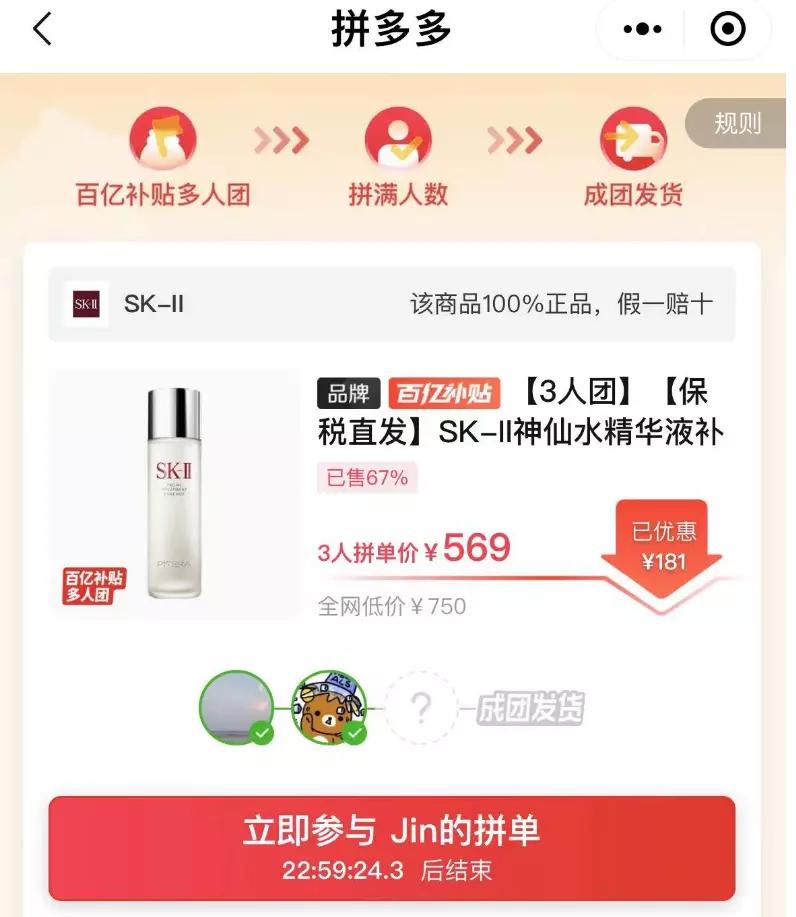 拼多多渠道,多人拼团加上平台补贴,230ml神仙水一瓶只要569元,是官方价格的三折左右。
