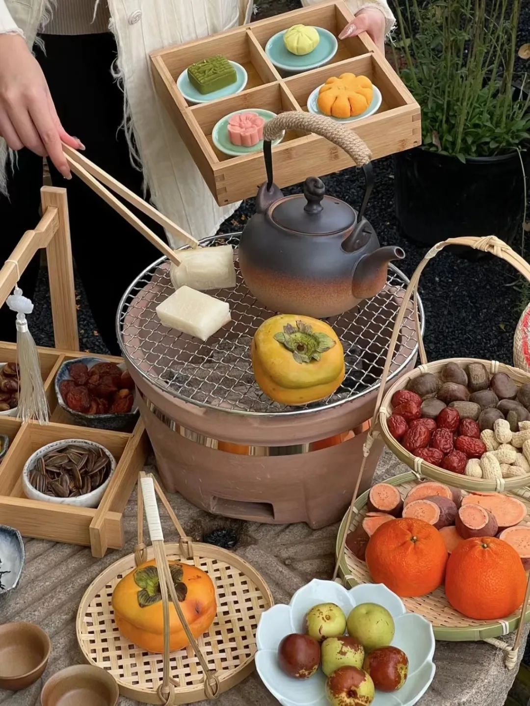 围炉煮茶受到人们追捧的同时,不少商家也从中嗅到了商机,利用各种各样的方式打造围炉煮茶的周边。