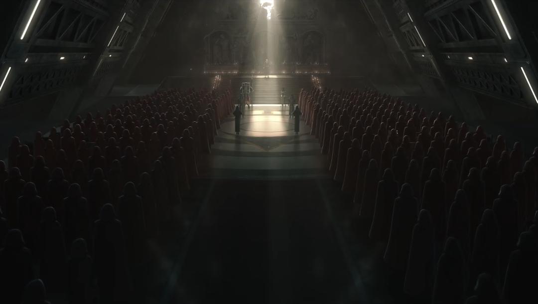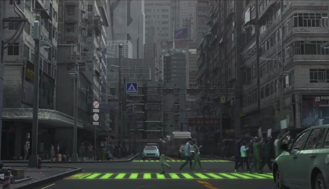 科幻大片一定要有大场面,所以第一集就安排了“古筝计划”的剧情,让“审判日”号在巴拿马运河上爆炸。为了追求科幻末世的故事背景,于是将进入“危机纪元”(实则是2008年)的城市,做成了《赛博朋克2077》的样子。然后再安排一场“地铁脱轨”的场面,以及史强带着主角罗辑“飞车”的追逐戏来营造紧张气氛,至此给人一种好莱坞大片的既视感。但是这种模式化的内容,显然不是粉丝们期待看到的内容。