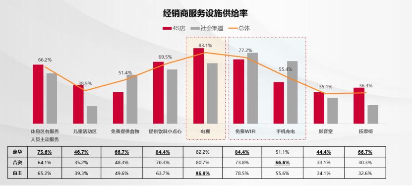 售后服务场景中,透明车间、免费WIFI和手机充电等硬件配套设施建设有利于满意度提升。近六成用户开始关注并通过透明车间了解车辆维保进度;服务设施供给方面,4S店的电视、按摩椅、儿童活动区等设施供给率高于社会渠道,但在“手机不离手”的现代生活中,社会渠道在免费WIFI、手机充电等领域更高的供给率,更匹配用户需求。