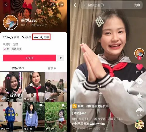 以抖音平台的数据为例,其中,姐姐的个人账号粉丝来量仅7000多,妈妈的个人账号账号粉丝量为5.2万,但是妹妹当当的个人账号@煎饼aaa 却有44.4万粉丝,数据最好的一条视频获赞37万。