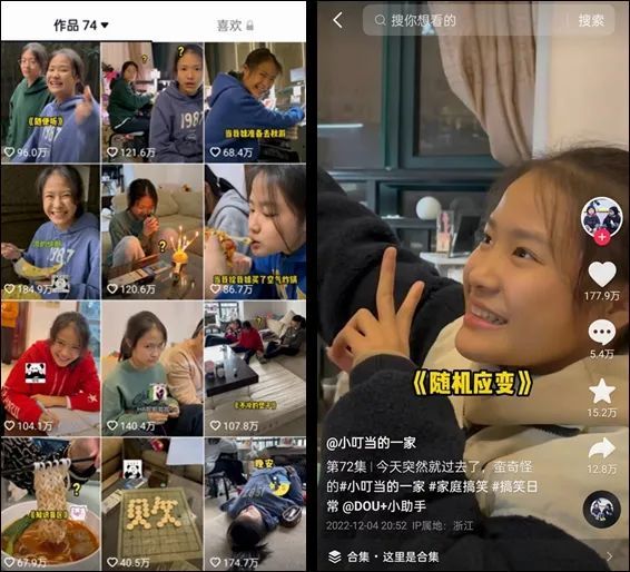 从@我是田姥姥、@张若宇、@疯狂小杨哥等,到如今的@小叮当的一家和@温暖一家,不难看出,以家庭为核心创作搞笑剧情内容,是短视频领域屡试不爽的流量密码。