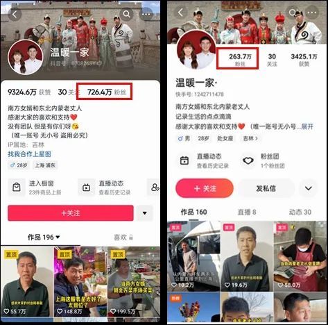 目前,“温暖一家”共创作了196个作品,抖音粉丝达727万,快手粉丝达263万。飞瓜数据显示,其在抖音近30天涨粉198万,在快手近30天涨粉81.9万。