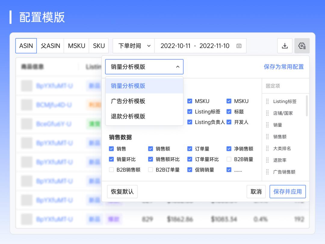 卖家可根据分析需求,在领星ERP配置关键数据保存为模板,比如: