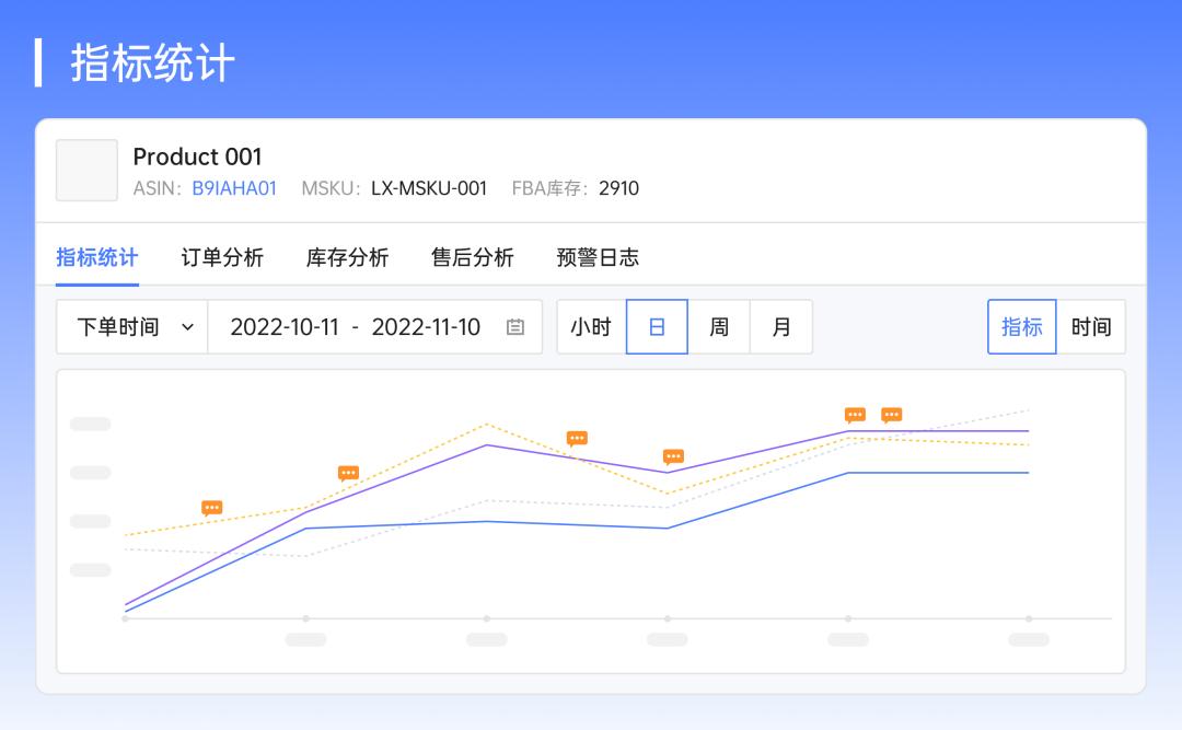 领星ERP自动统计产品的销售、广告、售后、库存等多维的关键数据,以数据和图表呈现;