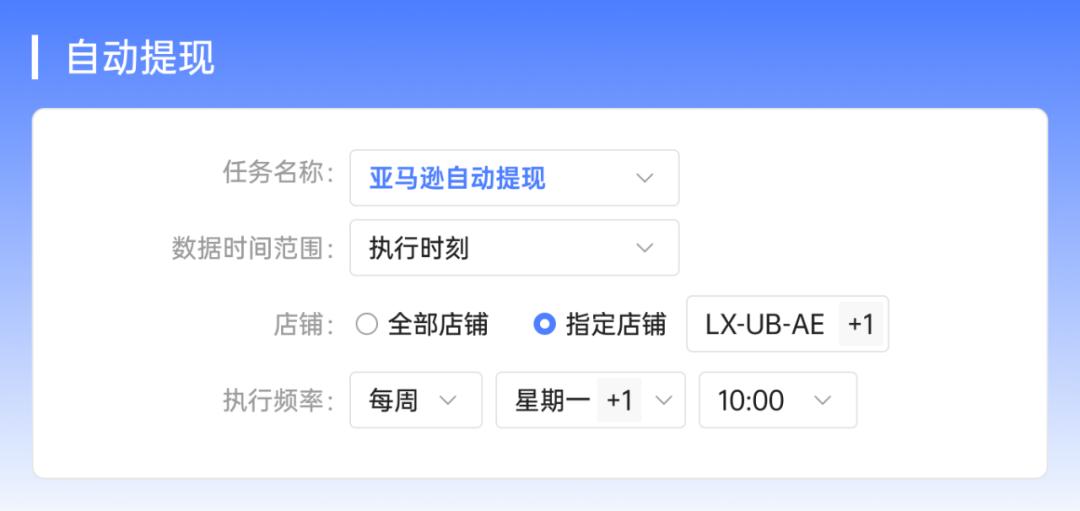 借助领星ERP,卖家可设置定时任务,自动去亚马逊后台进行提现操作,实现每月、每周乃至每天定时自动提现,减少亚马逊资金积压风险。