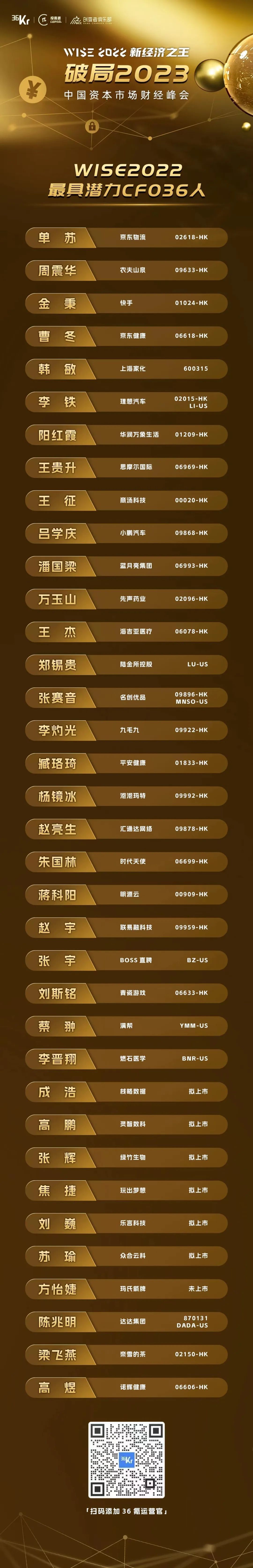 在此次论坛结束前,主持人还公布了由36氪联合沙利文捷利云科技共同发起的《WISE 2022最具潜力CFO36人》评选最终名单,名单如下