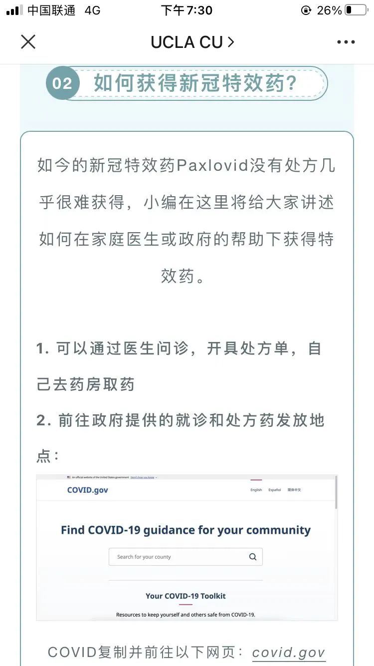 此外,也可前往政府提供的就诊和处方药发放地点获取药物,即Test-To-Treat program。Test to Treat 指的是提供检测、就诊与药物(从测试到治疗)的地点。进行新冠检测之后如果确诊,就会有专门的专业人士对患者进行一个简单的诊断和就诊,并开具处方药,当场即可拿药。而如果患者手上已经有了家庭医生或其他医护人员开具的处方单,也可以直接带着处方单来到这个地点进行取药。