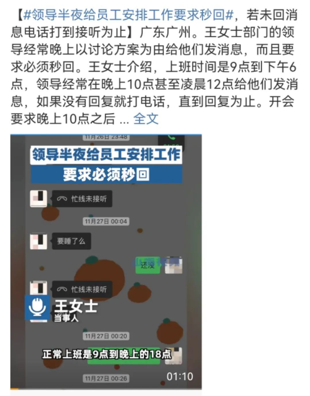 最近,一个员工下班后,被领导发消息强制要求参与方案讨论的新闻被曝光。