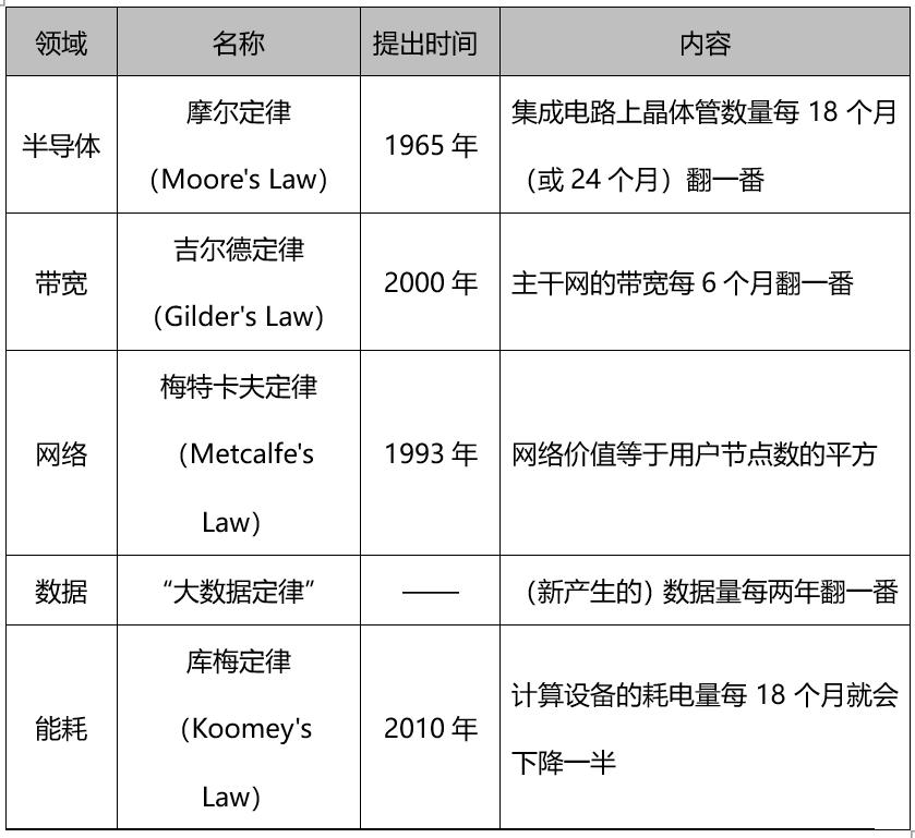 摩尔定律是数字时代的核心准则。“每隔一段时间就翻一番”的进步速度在数字技术领域普遍存在,它们有着各自的“摩尔定律”。比较典型的是带宽方面的吉尔德定律、网络方面的梅特卡夫定律、数据方面的“大数据定律”和能耗方面的库梅定律。如下表所示。