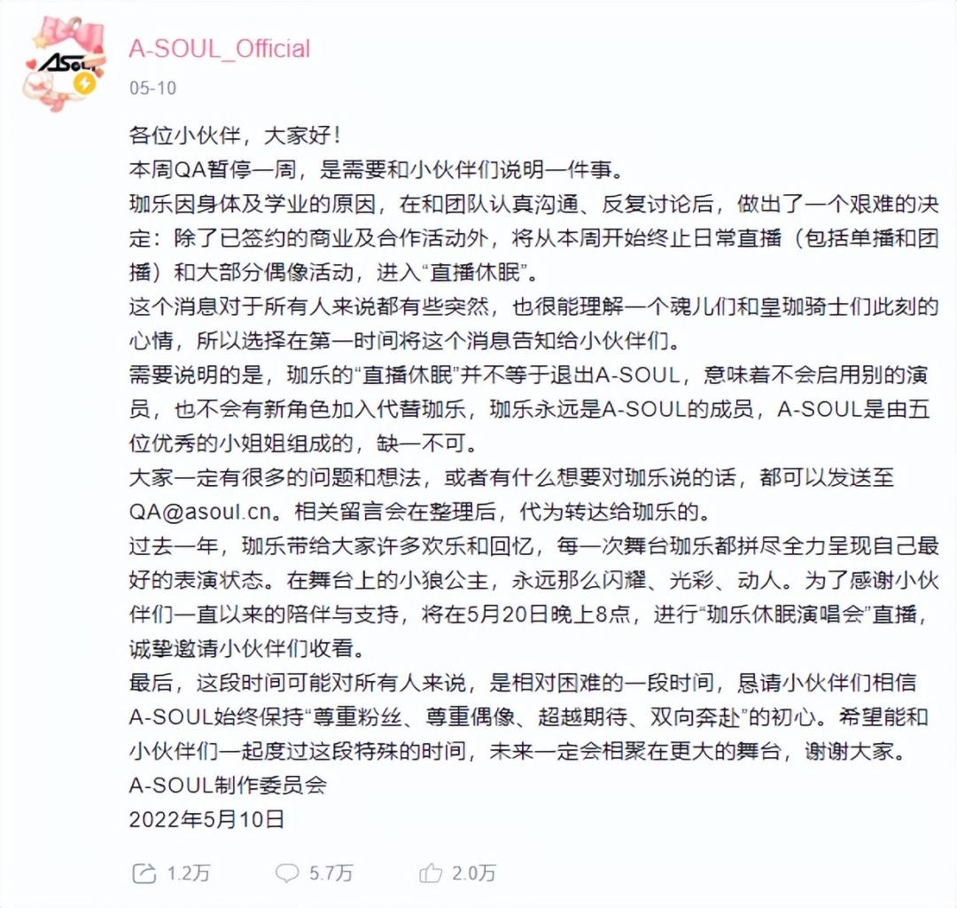 5月10日,如日中天的虚拟主播团体A-SOUL出现了成员变动,当天制作委员会发布公告称,成员珈乐由于“身体和学业的原因”进入“直播休眠”。此前半个月里,A-SOUL成员深陷被开盒(指虚拟角色扮演者被爆出)风波。