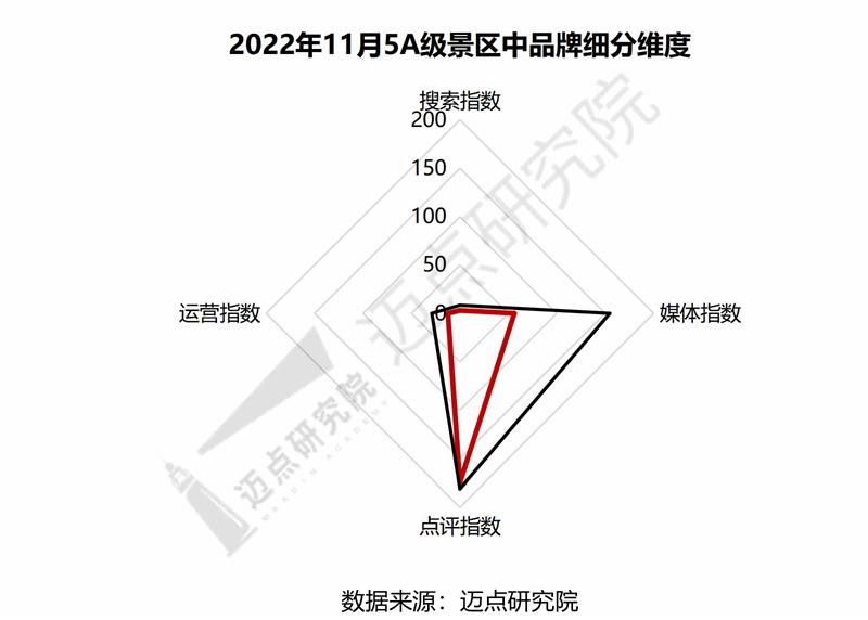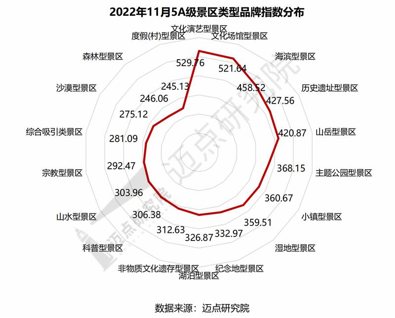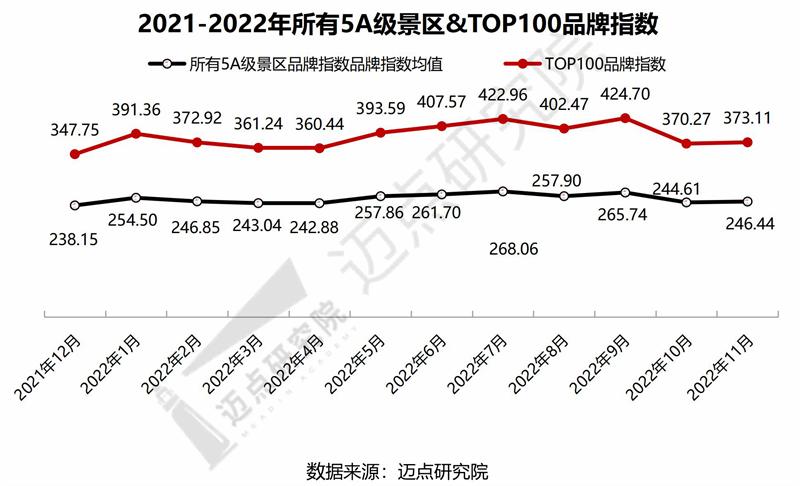 经迈点研究院监测,11月5A级景区品牌指数略有回升,所有5A级景区的平均品牌指数为246.44,环比上升0.75%;11月100强5A级景区MBI品牌指数均值为373.11,环比上升0.77%。多地防控举措不断放宽,出行阻碍不断减少,景区市场再度活跃,为适应开放以后的旅游市场,各大景区不断丰富旅游产品、服务以满足市场需求。