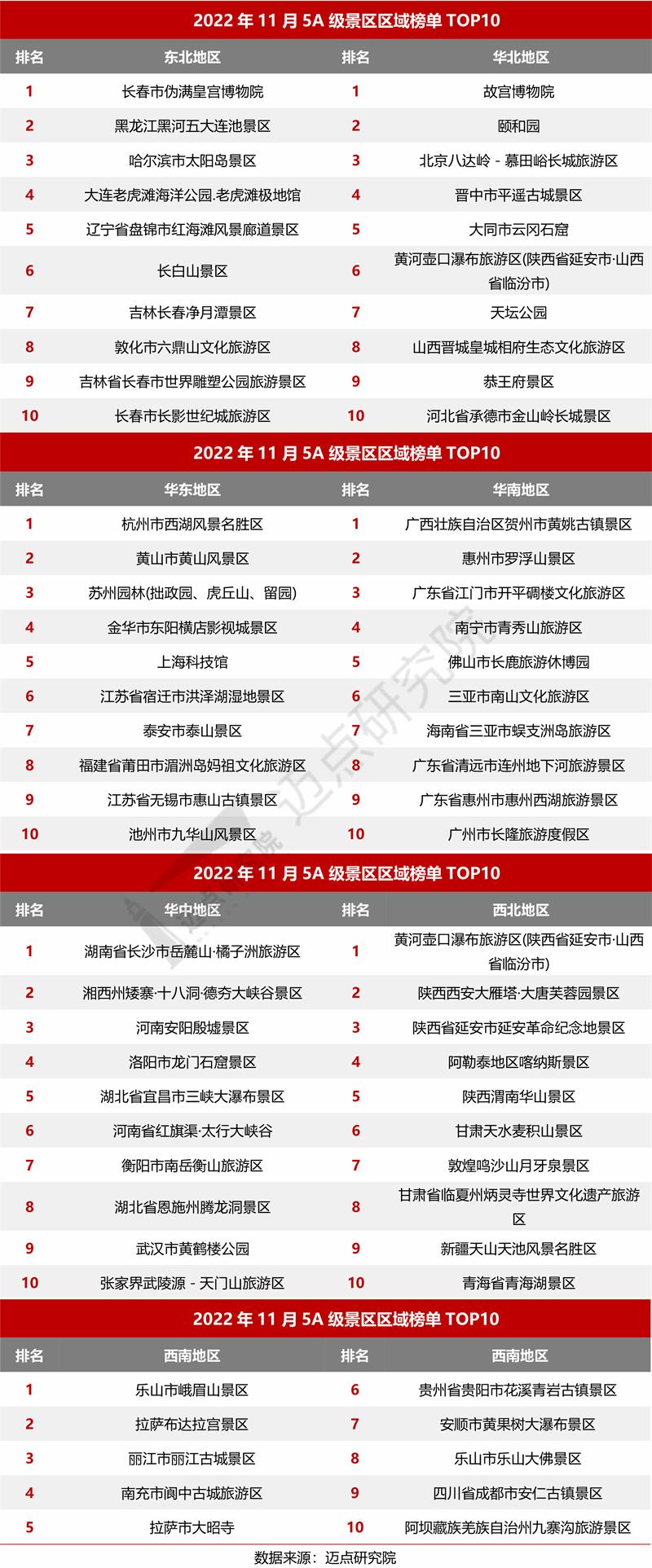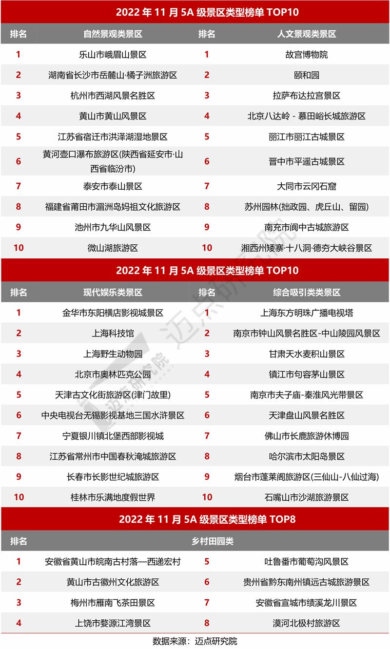以下是迈点研究院独家发布“2022年11月5A级景区品牌影响力(MBI)100强榜单”。 11月,故宫博物院、乐山市峨眉山景区、颐和园表现抢眼位列前三甲,湖南省长沙市岳麓山·橘子洲旅游区、杭州市西湖风景名胜区、拉萨布达拉宫景区、北京八达岭-慕田峪长城旅游区、黄山市黄山风景区、丽江市丽江古城景区、晋中市平遥古城景区跻身榜单前十。