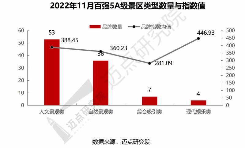 5A级景区百强榜单中,人文景观类、自然景观类依旧稳居冠亚军,分别上榜53和36个5A级景区;细分类型中,以历史遗址型景区、山岳型景区、小镇型景区为主,分别占据31、13、11个席位。从品牌指数来看,11月5A级景区各类型中品牌指数由高到低分别为:现代娱乐类景区(446.93 )、人文景观类景区(388.45 )、自然景观类景区(360.23 )、综合吸引类景区(281.09 )。细分类型品牌指数由高到低分别为:文化演艺型景区(529.76 )、文化场馆型景区(521.64 )、海滨型景区(458.52 )。