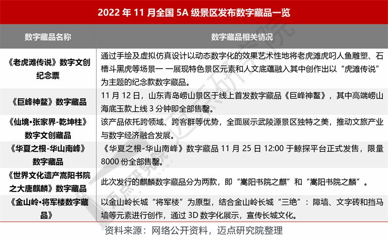 11月全国5A级景区通过数字藏品发布盘活业绩,不断挖掘特色文化优势,补充文旅市场供给。武陵源风景区推出“仙境·张家界-乾坤柱”数字文创藏品,该产品依托跨领域、跨客群等优势,全面展示武陵源景区独特之美,推动文旅产业与数字经济融合发展。近年来武陵源风景区的发展建设力度不容小觑,数字藏品的发布也意味着景区正式进军数字发展新赛道,通过实体赋能线上数字文创藏品,带动景区运营模式多元化发展。