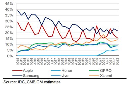 另一方面,在QuestMobile最近发布的2022中国智能终端市场半年报告中,从6月活跃设备数量占比来看,TOP5的华为、Apple、OPPO、vivo、小米分别为25%、21.7%、19.9%、14.6%、10.3%,总体占比超过九成。