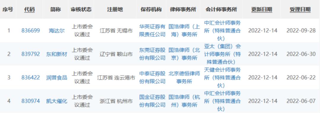 凯大催化、润普食品、东和新材和海达尔北交所过会,其中三家为“专精特新”企业