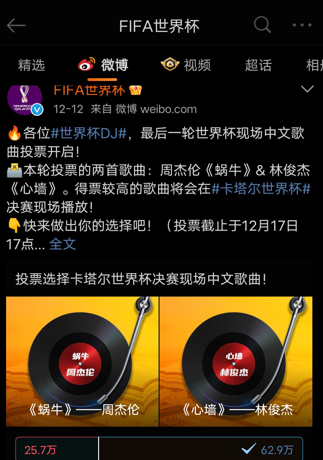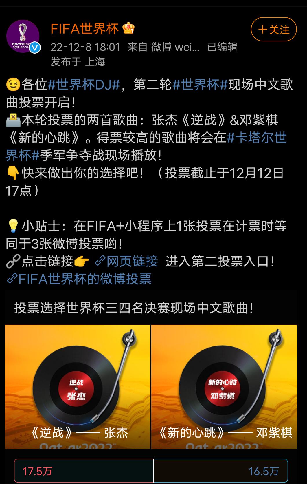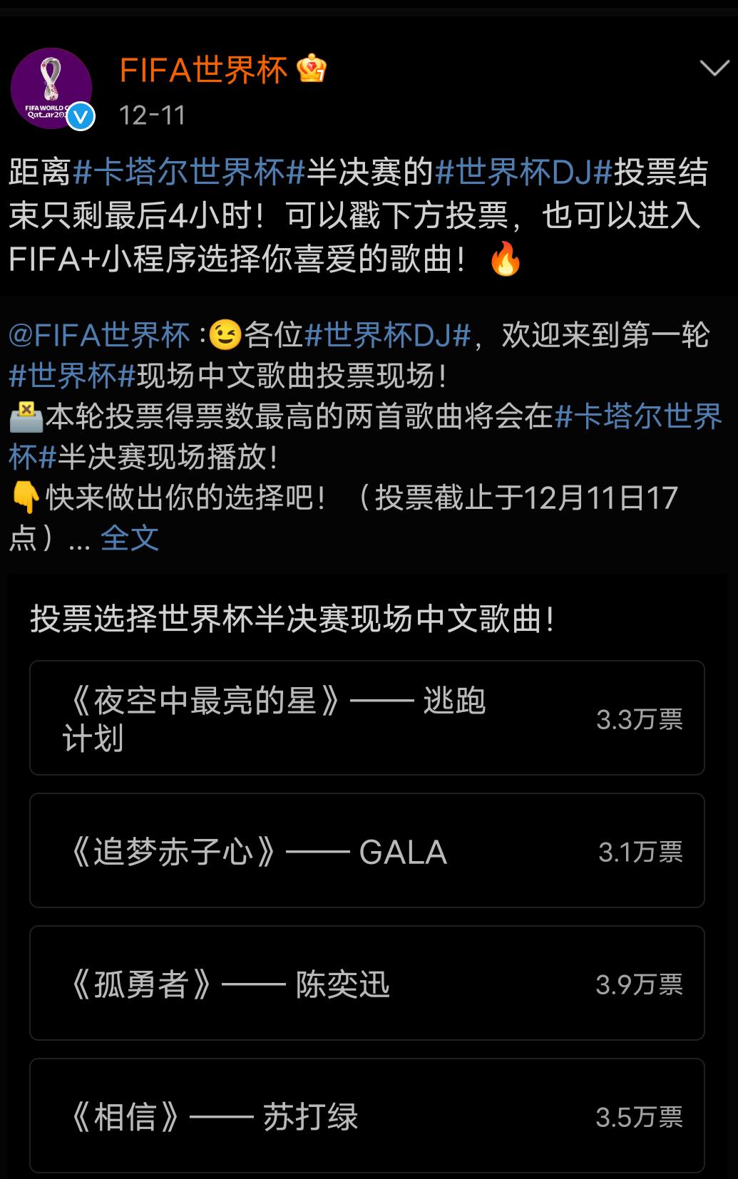 12 月 11 日,世界杯官方发起投票,网友可通过 FIFA 小程序对四首歌曲进行投票,得票数最高的两首歌将在世界杯半决赛响起。