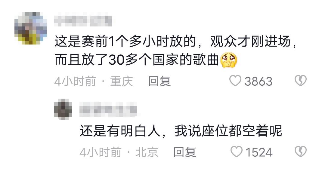 也有网友道出事实:“《孤勇者》是在比赛还没开始的时候放的,当时一共放了 30 多个国家的歌曲,而且现场根本没啥球迷。”