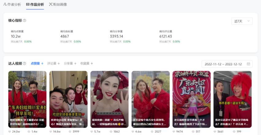 而针对达人的作品,「达人指数」也分时间段展示了包括稿均点赞量、稿均涨粉量、稿均分享量、稿均评论量在内的四个核心指标,并支持以点赞、评论、分享、收藏4个维度筛选查看作品。