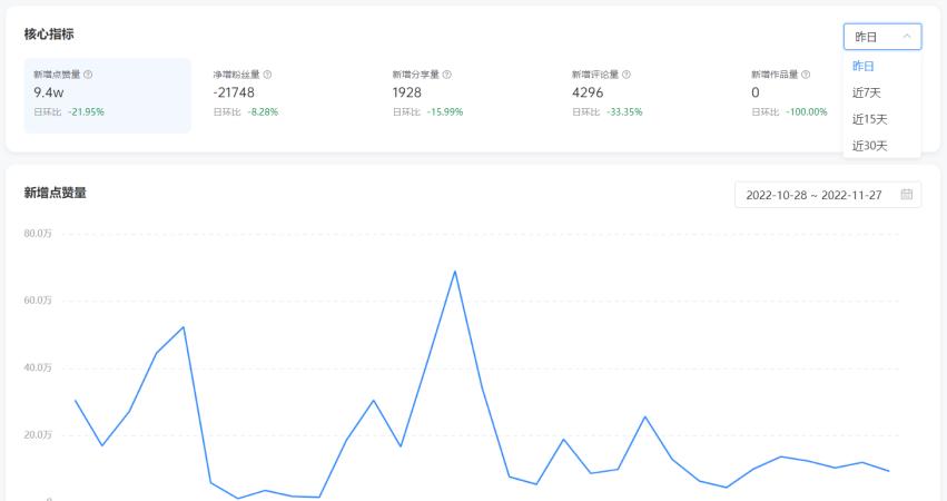 譬如通过「达人指数」搜索“广东夫妇”我们不仅可以看到其总粉丝量和点赞量,还可基于不同时段查看账号的新增点赞量、净增粉丝量等核心指标。「达人指数」应该已实现全量达人的收录,据克劳锐亲测,虽然小编只有几百的粉丝,但依旧可以被检索到。