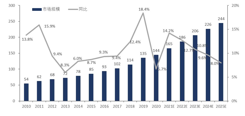 2010-2025年中国防晒产品市场规模,单位:亿元 资料来源:Euromonitor,36氪