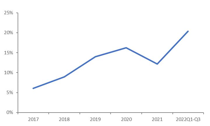 2018-2022Q3科思股份营收及其增速,资料来源:wind,36氪