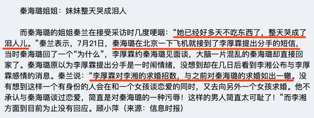 彼时,李厚霖面对镜头,拒不承认与秦海璐有过恋情。秦海璐的姐姐秦楠则告诉记者:秦海璐在家痛哭,已经好几天滴米未进了。