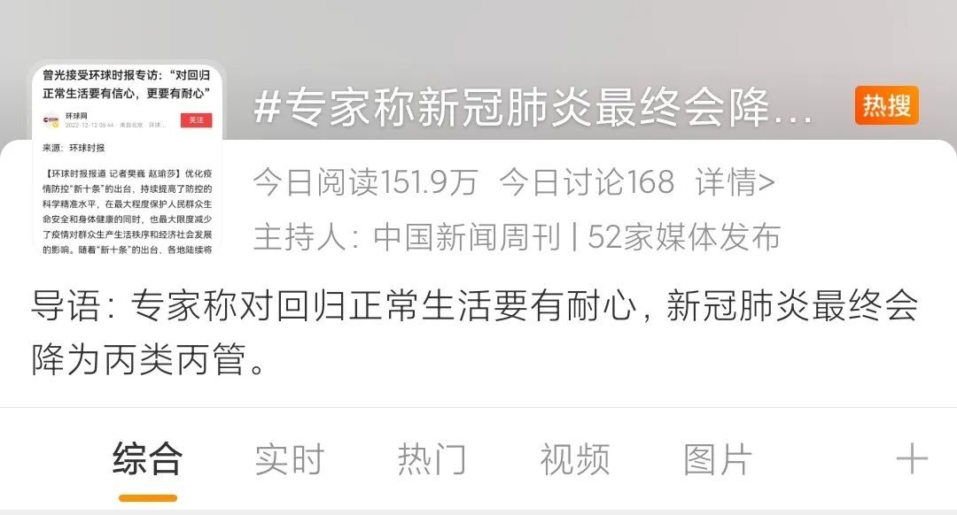 优化落实疫情防控「新十条」出台不到一周,「专家称新冠肺炎最终会降为丙类丙管」的话题登上热搜。