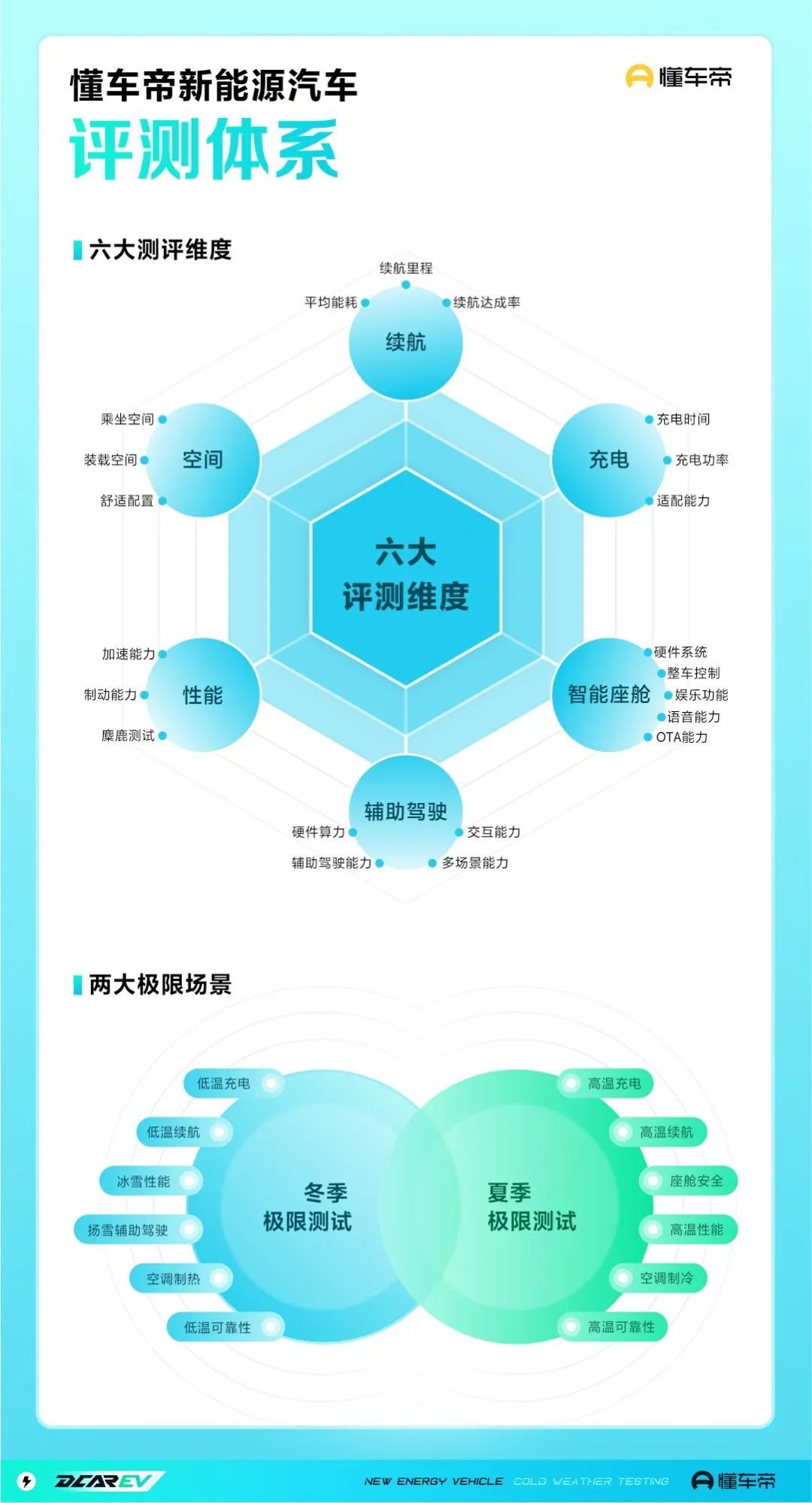 此外,在规模化实际测试了140余款新能源汽车的基础上,懂车帝正式推出了“6+2新能源汽车评测体系”。该体系共分续航、充电、辅助驾驶等6大维度和冬夏季极限评测2大场景,基于客观真实的实测数据,对新能源车进行综合评分,为消费者提供选买参考。