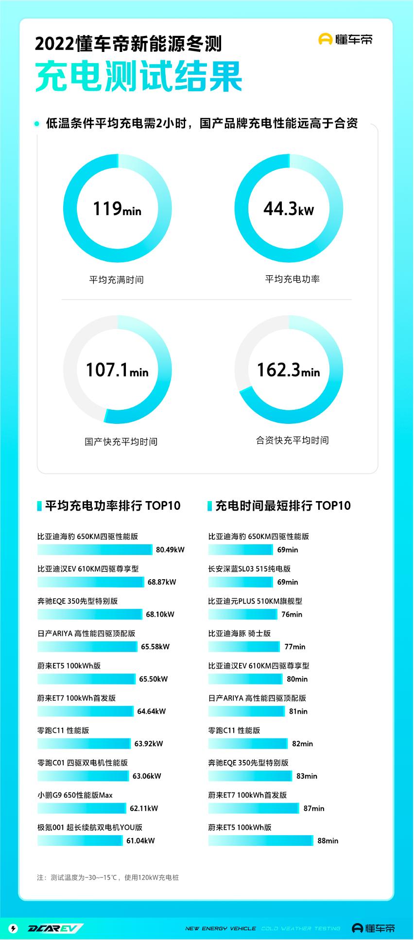“从测试结果来看,新能源车性能和稳定性已经不输燃油车,即便是严寒天气下,消费者也可以放心选买。同时,国产车相比合资品牌进步明显且产生一定优势,为消费者提供了多样化选择。”懂车帝新能源测试负责人介绍。