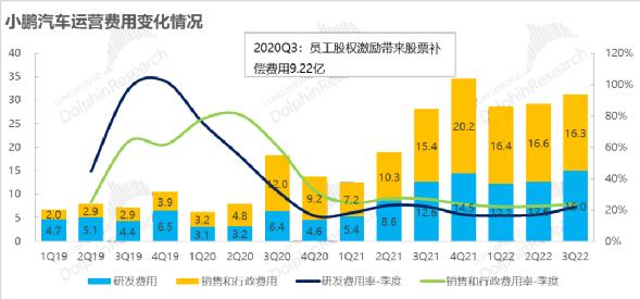另一边,汽车产品力弱于同行,小鹏不得不维持较高的营销费用。为了快速向全国市场渗透,2021年小鹏开放了加盟模式(蔚来和理想全部直营),整体门店数呈现快速扩张的局面。但销量在2022年呈现萎缩的态势,使得运营成本无法分摊,2022年Q3显示运营亏损率已经达到32%,亏了22个亿。