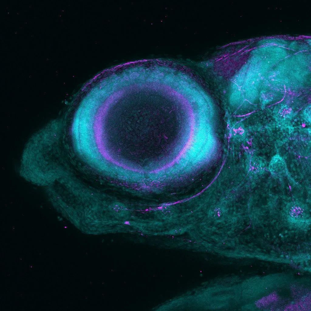 University of Sussex在共聚焦显微镜下,突出线上出的斑马鱼幼苗眼睛中的神经细胞