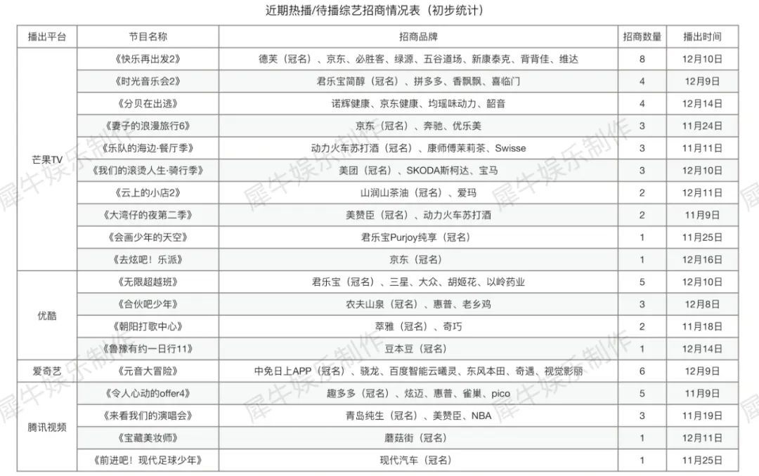 如今临近年底,事情似乎有了些转机。事实上,下半年综艺招商的整体表现要明显优于上半年,先是Q3接连涌现出《披荆斩棘2》《这!就是街舞5》等多档10余家赞助的项目,再到如今的Q4,频繁上新的新老综艺都取得了不错的招商成绩。