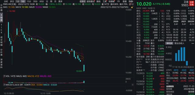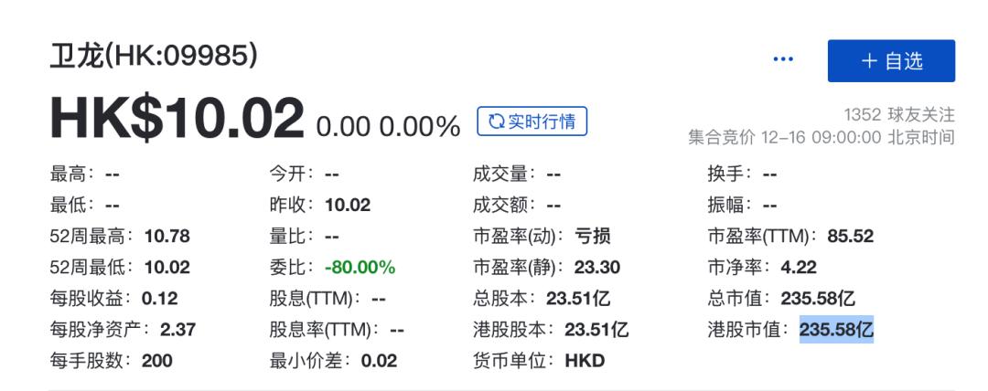 昨日,“辣条第一股”卫龙正式在港上市。其股票发售价为每股10.56港元,开盘价每股10.2港元。值得注意的是,12月14日,卫龙的股价就在暗盘下跌,跌幅一度超过6%。截止昨日收盘,卫龙股价为每股10.02港元,公司总市值235.58亿港元。
