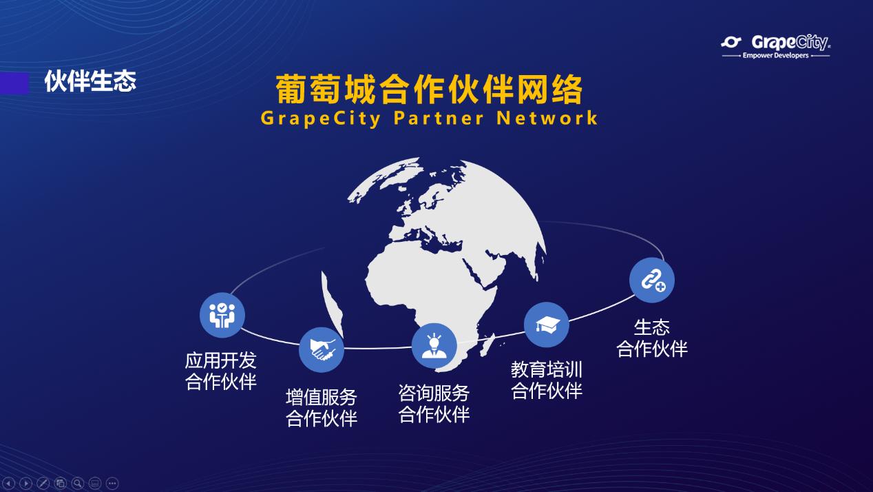 秉承“先伙伴投入而投入,后伙伴成功而成功”的合作理念,葡萄城提供了由人员、服务、软件开发技术和软件系统构成的合作伙伴网络(GCPN),旨在为合作伙伴提供优质的技术解决方案、高质量的培训、支持和赋能计划,通过云帆计划伙伴赋能体系与合作伙伴共同成长,并基于葡萄城市场连接合作伙伴与企业客户,帮助合作伙伴拓展业务。