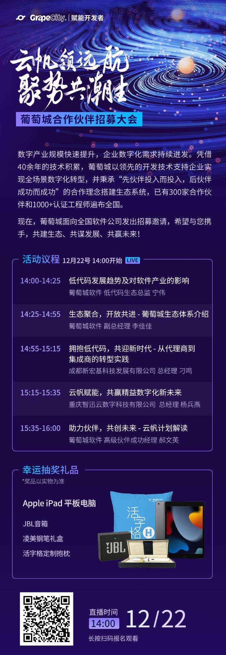 云帆领远航,聚势共潮生。12月22日下午14:00,葡萄城伙伴招募大会即将盛启,通过线上直播的方式与大家见面,深度解析低代码发展趋势及对软件产业的影响,与葡萄城携手共建生态、共谋发展、共赢未来!