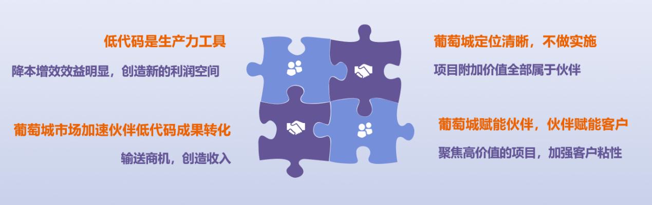为了建立一个合作共进、互利共赢的商业模式,葡萄城提供低代码技术作为生产力工具,帮助伙伴降本增效,创造新的利润空间,同时坚持着清晰的定位,不做实施,让项目附加价值全部属于伙伴。