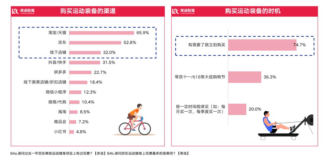 在消费方面,运动消费的主力是高线级城市的中年男性,他们购买力强,且他们更偏向在有需要时就立刻在线上购买,在消费中投入最多的是运动设备。