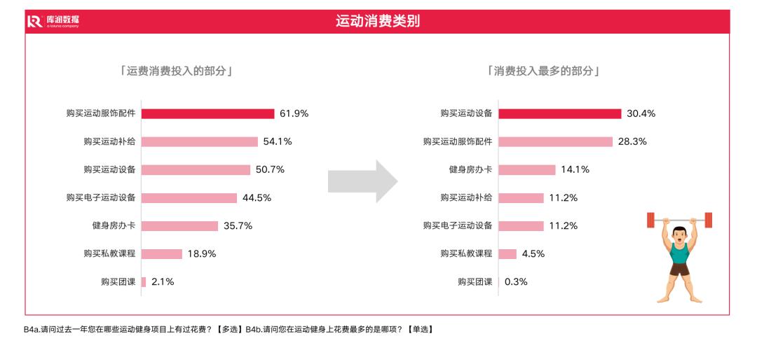 而在投入花费最多的品类里,运动设备位列第一,其次是运动配件。